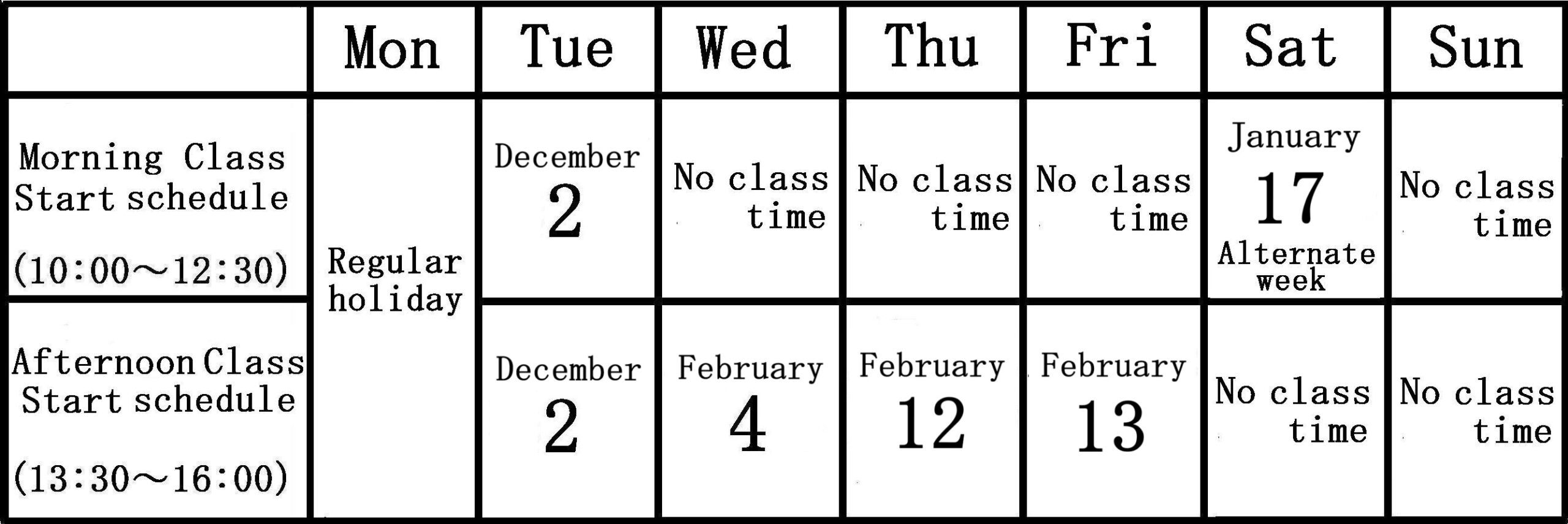 Weekly class program starting in December and February.