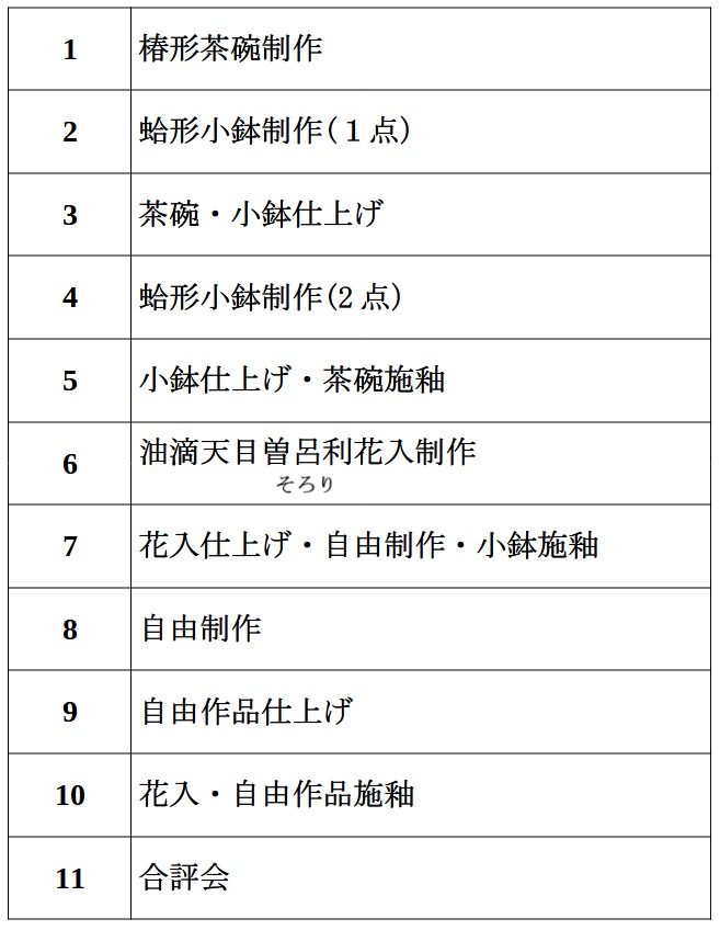 陶芸を深くじっくり楽しみたい方は週1クラス。こちらでテーマを決めて全11回のプログラムを組んでおりますので、初めての方も経験者もお楽しみいただけるクラスです。ご興味のある方は是非一度、教室見学にお越し下さい。